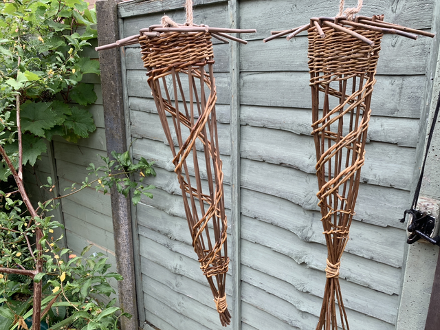 In this willow weaving bird-feeder course, you will use a jig to create a spirally woven bird feeder for holding fat balls in the garden. These can also be used for supplying nesting materials for birds in the early spring. (its a great way of making use of some of that excessive dog hair) Alternatively, these bird feeders can be used as kitchen containers for items such as garlic or small oranges, looking particularly attractive on the kitchen wall. (Often for kitchen use, they will be scaled down a little.) A jute rope is used to provide a robust and aesthetically appropriate handle.